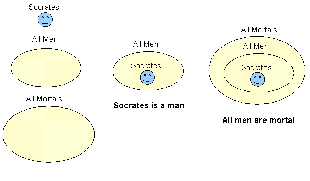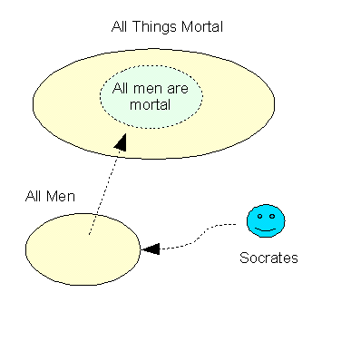 The exclude middle is Socrates, linking Men and quality of being mortal. But clearly there is a problem here. There is an implicit assumption that Socrates represents all men or more explicitly, "Man is Socrates". We know that is not true but, nonetheless, this sort of inference seems to occur quite often in everyday language as over-generalizations. In fact, we could equally associate "men and "mortals" in the other direction and conclude that "All mortals are men", based on the sole example of Socrates.