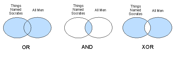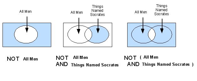 The diagram below show the adding and subtracting behavior of logical OR and AND, with the help a new category "Things Named Socrates", including people, pets, computer applications, anything denoted by the word 'Socrates'.